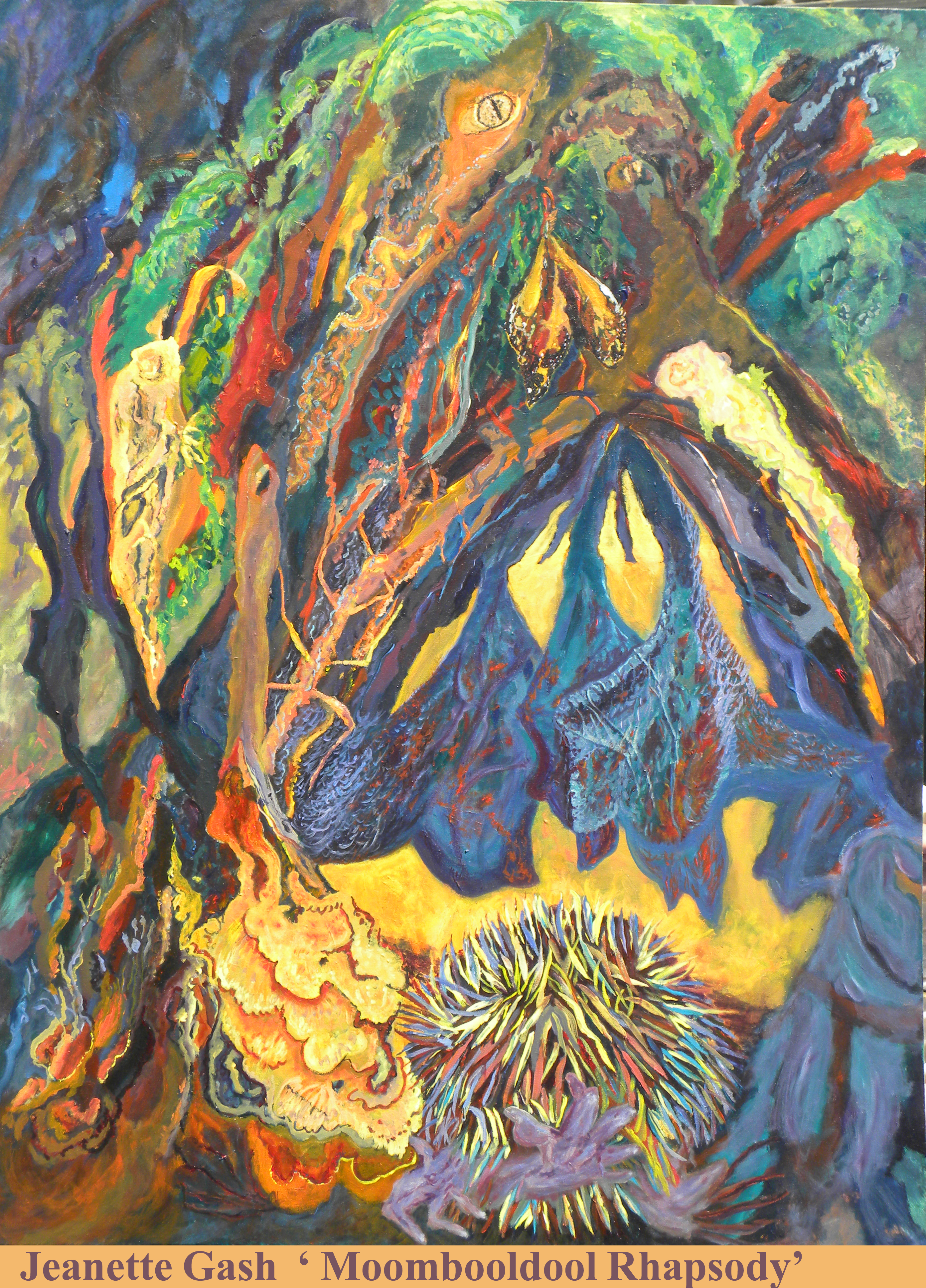 ‘Moombooldool Mega Fauna’ is number three of a series of paintings of the Moombooldool mallee remnant. This roadside strip of vegetation is a sad relic of a former natural wilderness.